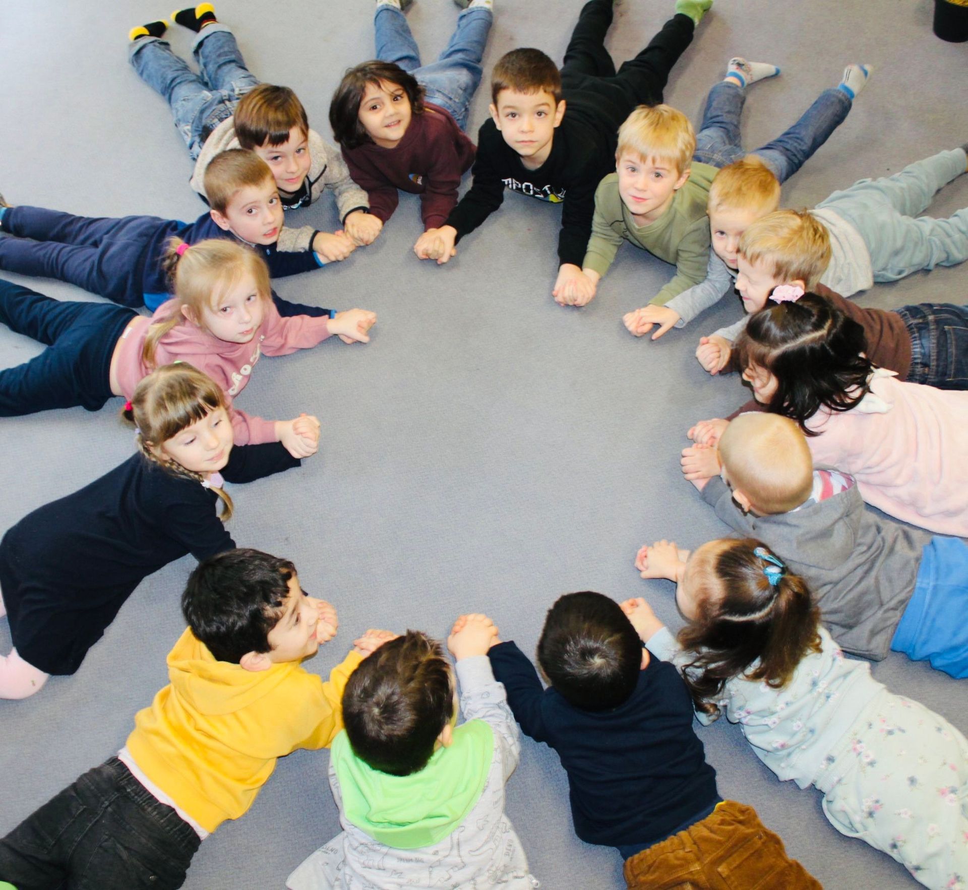 Unsere Kinder erhalten ein tägliches buntes, tolles Programm, z. B. gemeinsames Spielen und Lernen sowohl in der Natur als auch in Spiele- und Klassenräumen.